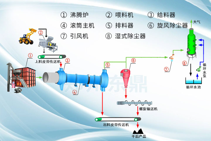 2、采用順流干燥方式,煙氣與濕物料由同一側(cè)進(jìn)入干燥機(jī),可以利用高溫?zé)煔猥@得很高的蒸發(fā)強(qiáng)度,烘干機(jī)出口溫度低,熱效率高;